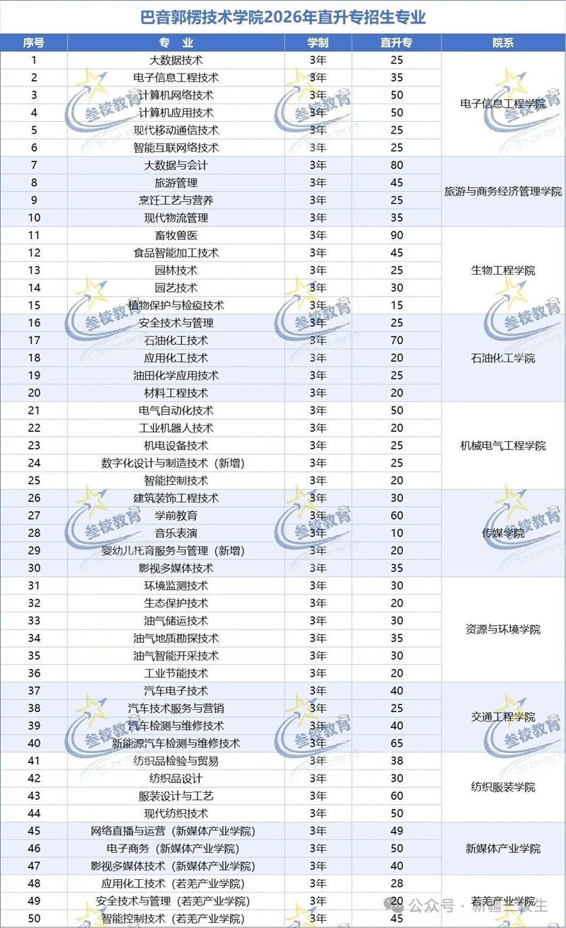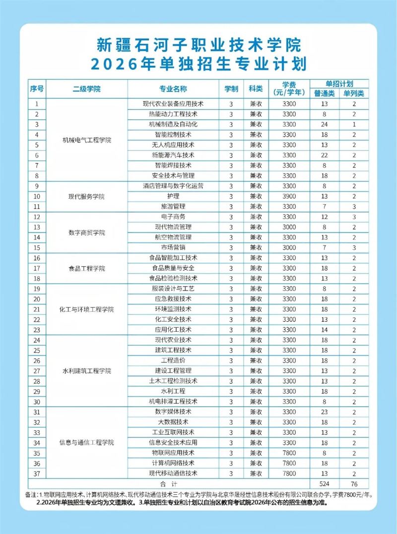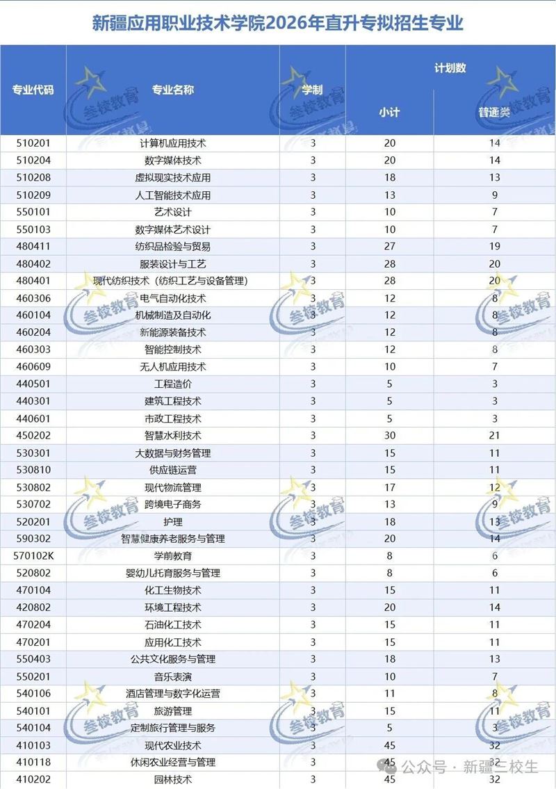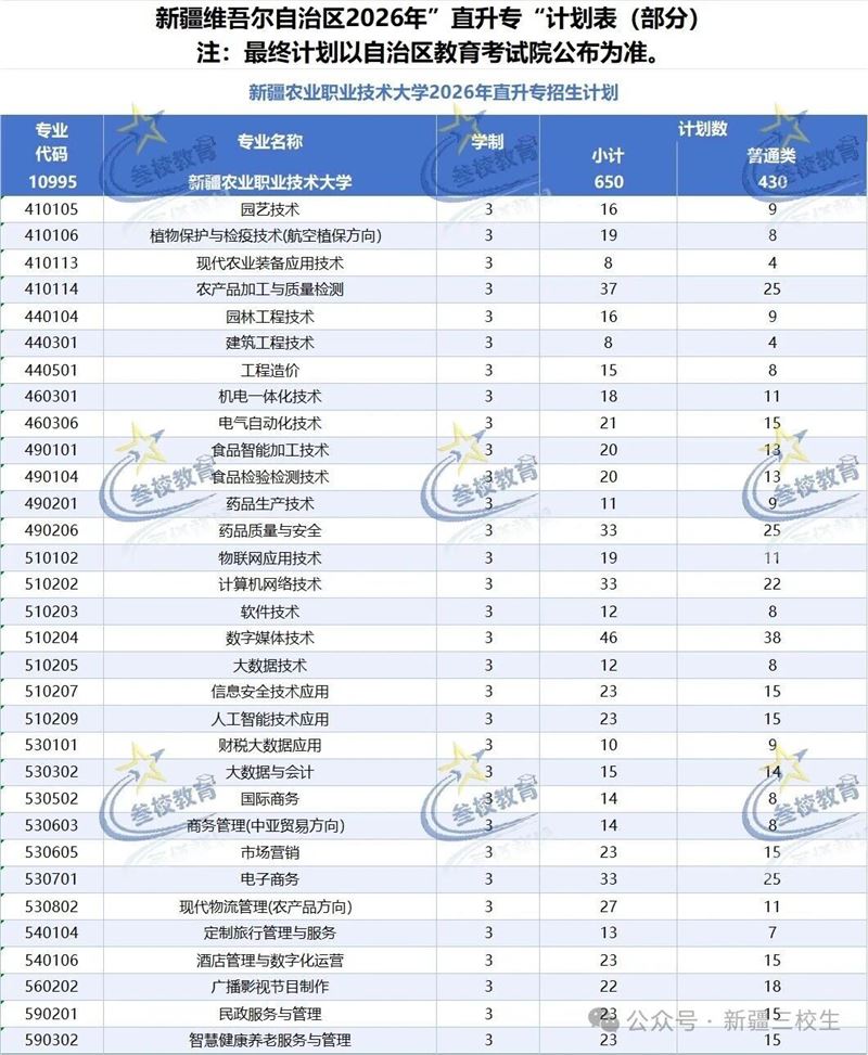 2026 年新疆直升高职(专科)招生计划(部分)重磅出炉!涵盖新疆农业职业技术大学、克拉玛依职业技术学院、巴音郭楞职业技术学院等多所院校,上千个升学名额,覆盖农林、工科、医护、信息技术、文