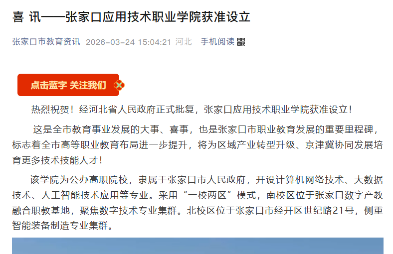据张家口市教育局官方微信公众号消息,3月24日,经河北省人民政府正式批复,张家口应用技术职业学院获准设立。信息显示,该学院为公办高职院校,隶属于张家口市人民政府,开设计算机网络技术、大数据技术、人工智